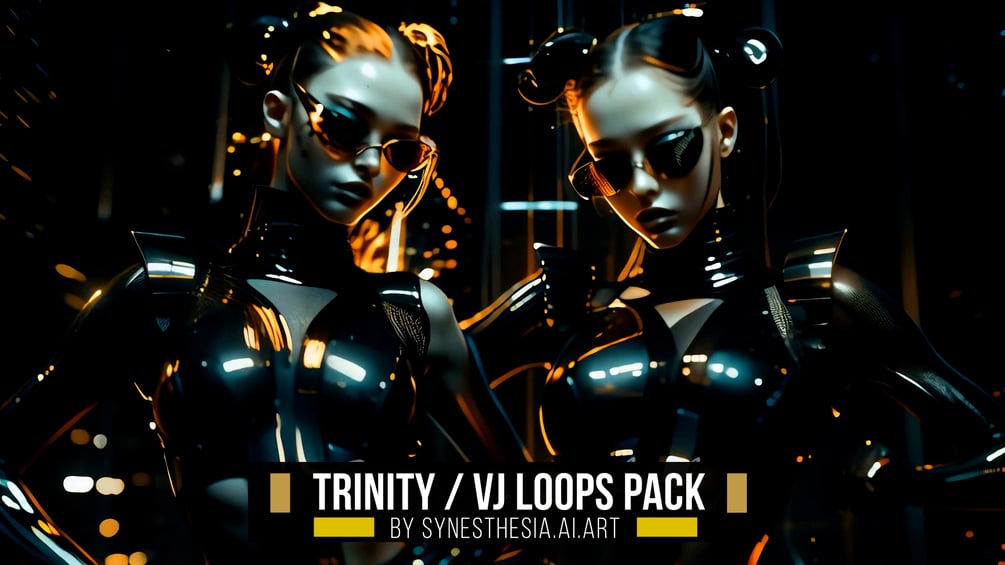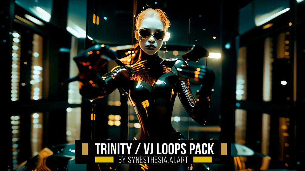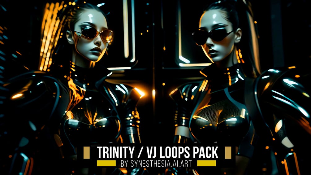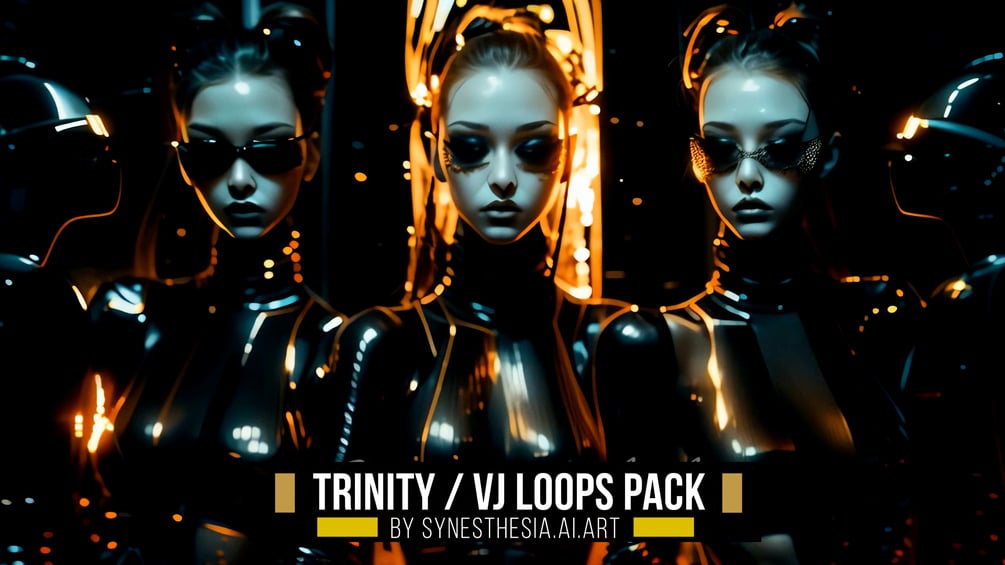 "Trinity is a hypnotic blend of digital divas in black suits, their movements a glitch in the neon matrix. Chrome bodies shimmer with golden vibes. A pulsating dance and movement where AI meets humanity. Dive in and get lost in the rhythm with feminine AI.